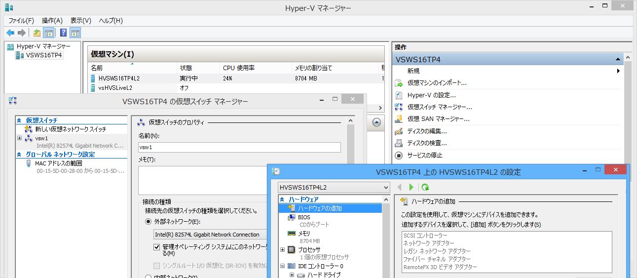 | 第1レベルの仮想Hyper-Vホスト (ESXi上の仮想マシン) | Hyper-V Server 2016 TP4 | ||