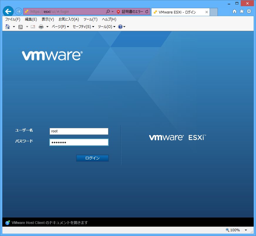 VMware ESXi 6.0.0 (VMKernel Release Build 3620759) プラットフォーム名 プロセッサ情報 xx GiB Memory ------------------------------------------------------------------------------------------------------------------- Download tools to manage this host from: http://動的IPアドレス/ (DHCP) .... <F2> Customize System/View Logs <F12> Shut Down/Restart |