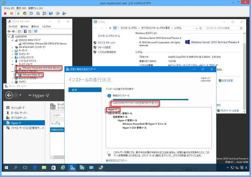 | 第1レベルの仮想Hyper-Vホスト (ESXi上の仮想マシン) | Windows Server 2016 TP4 | ||