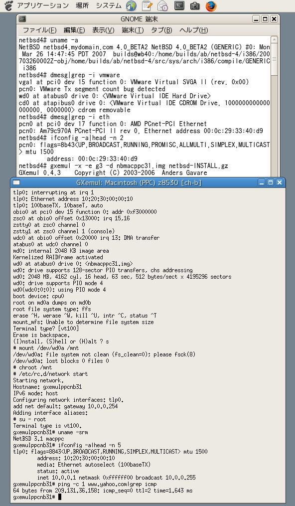 更に、VMware Server上のNetBSD/i386 4.0上のGXemul環境でのNetBSD/macppc 3.1についても若干紹介します。