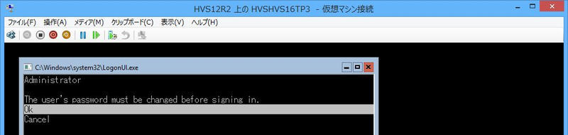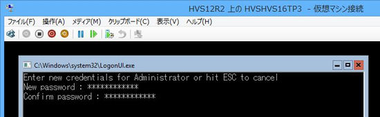 C:\Windows\system32>cmdkey /add:HVS12R2 /user:Administrator /pass 'Administrator'のパスワードを入力してください。'HVS12R2'に接続します:ここでHVS12R2側のAdministratorのパスワードを指定してEnterキー押下 【実行結果表示】 CMDKEY : 資格情報を正しく追加しました |