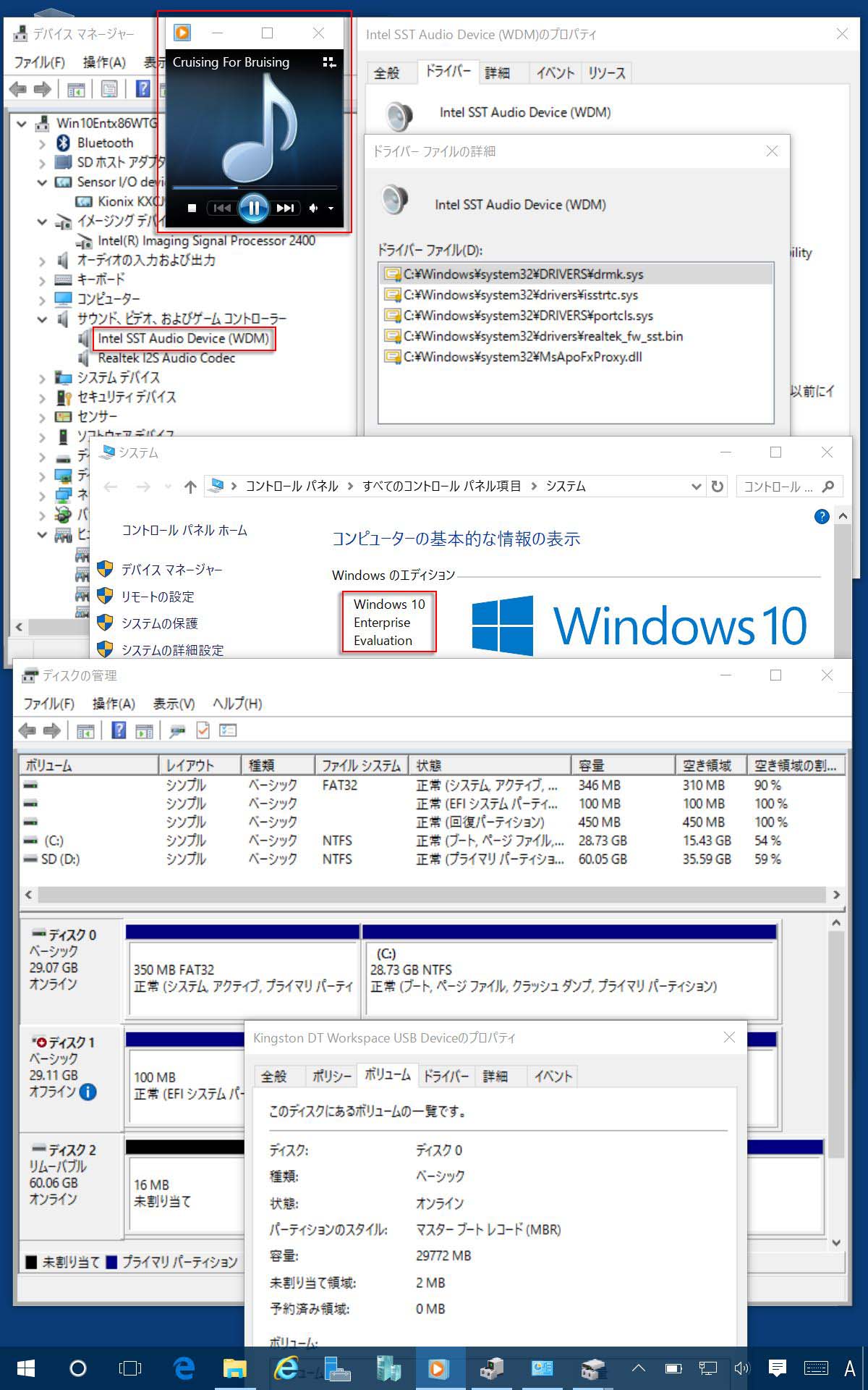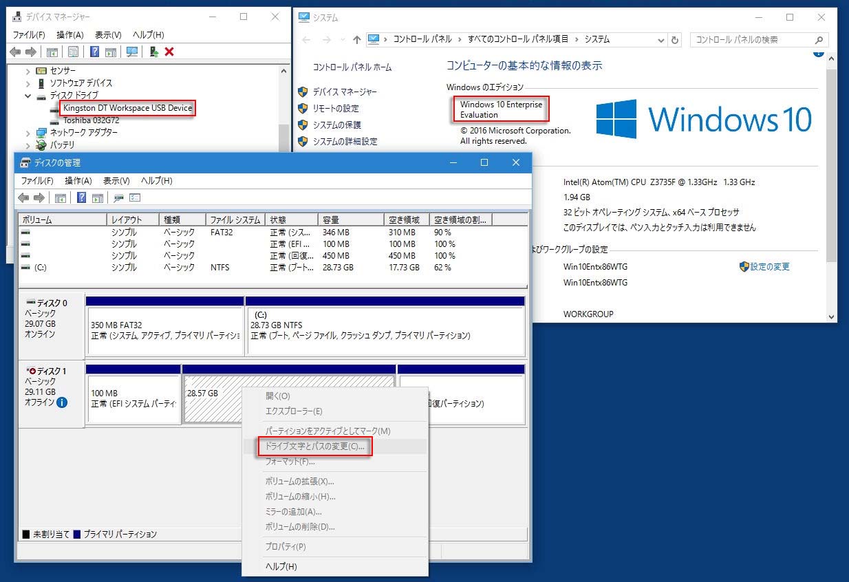 | 末端仮想マシン | OS = 32ビット版Windows 10 Enterprise (Windowsタブレット対応化したWindows 10 Enterpriseの Windows To GoワークスペースのP2V仮想マシン) |