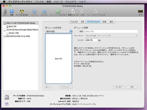 | /dev/sda2(8GB) ボリューム名:Base HD | Mac OS 拡張(ジャーナリング) | 予備 | 実質ダミー |