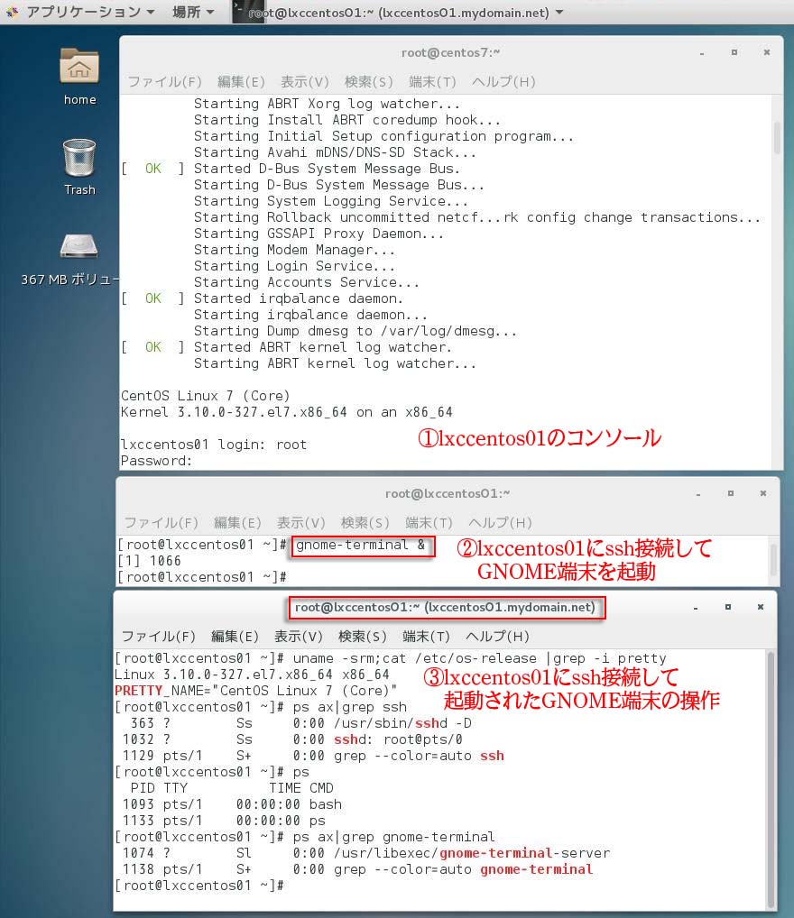 xhost + ssh -Y root@lxccentos01 root@lxccentos01's password: パスワード指定 gnome-terminal & これで母艦側にCentOS 7コンテナ(lxccentos01)のGNOME端末(ウィンドウタイトル:「root@lxccentos01:~(lxccentos01.mydomain.net)」)が表示されます。 |