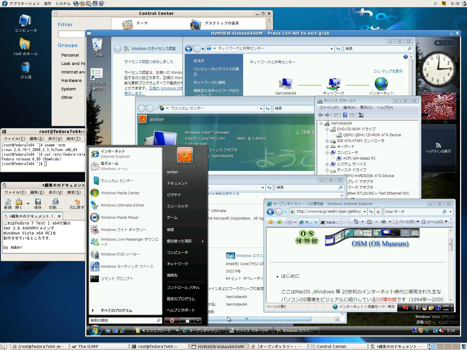 ※Fedora 7 Test 1 x86(32bit)版のXen(HVMドメイン)ではWindows Vista(x86)のネットワークが標準動作しないためそのx64(64bit)版を使用。
