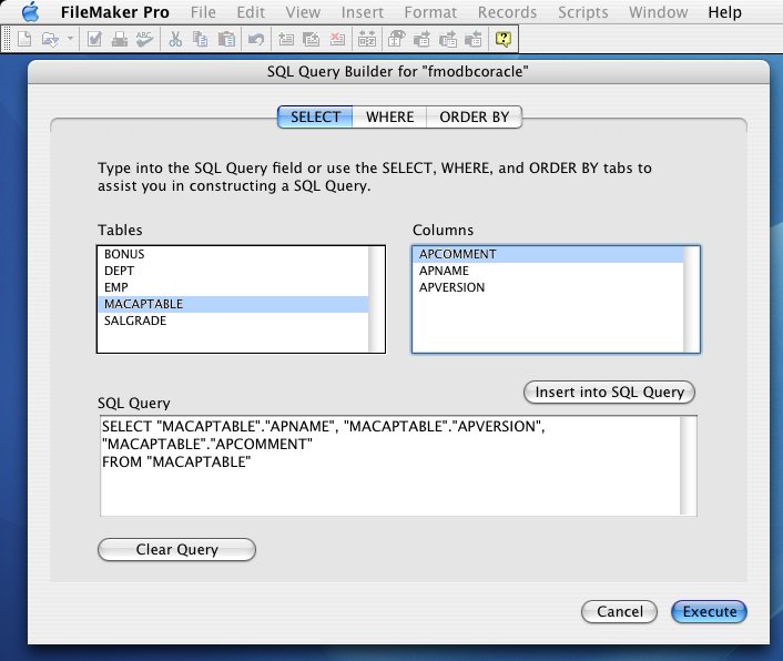 SQL Query BuilderによりSQLを生成し実行するとFileMaker Pro側にOracle9iのデータを取り込むことができます。