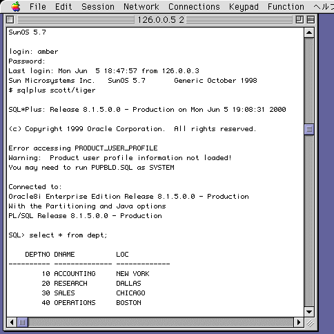 またMacOSからSolaris7にtelnetで入ってOracle8i サーバをアクセスしたのがこれです。