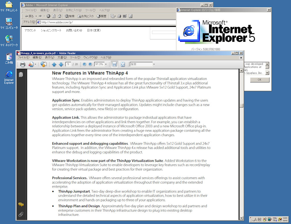 例えばWindows XP環境でパッケージング(仮想化)されたAdobe Reader 9もWindows NT 4.0環境では関数エラーが発生して利用できませんでした。