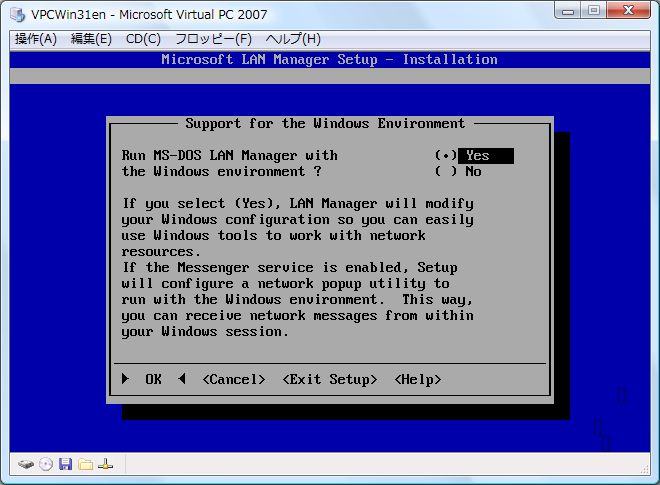 以下にVirtual PC 2007環境でのWindows 3.1(英語版)にLAN Manager TCP/IP環境を構築する手順を説明します。