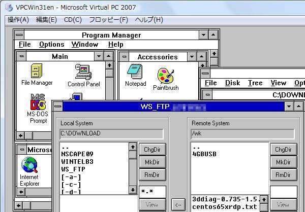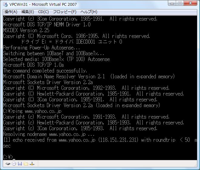 Virtual PC 2007(VPC2007)でのWindows 3.1(英語版)の利用でご紹介したWindows 3.1環境ではTCP/IPのネットワーク環境は未導入でした。