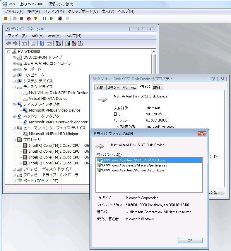 - デバイスマネージャによる仮想SCSIとそのドライバ情報確認
